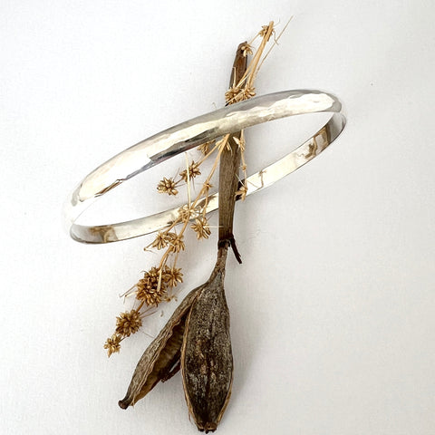 The hammered silver bangles are individually shaped and textured, with each strike of the hammer creating a unique, light-catching pattern—no two are ever the same. Tania’s handmade link bracelets feature carefully formed and connected links, often combined with her distinctive silver lace-imprinted elements, resulting in beautifully fluid, contemporary pieces.