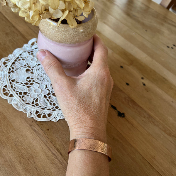 Copper is extremely durable and can hold up well over time, despite daily wear. It is a lovely metal with warm tones and can be easily polished using a polishing cloth or specialized copper polish.