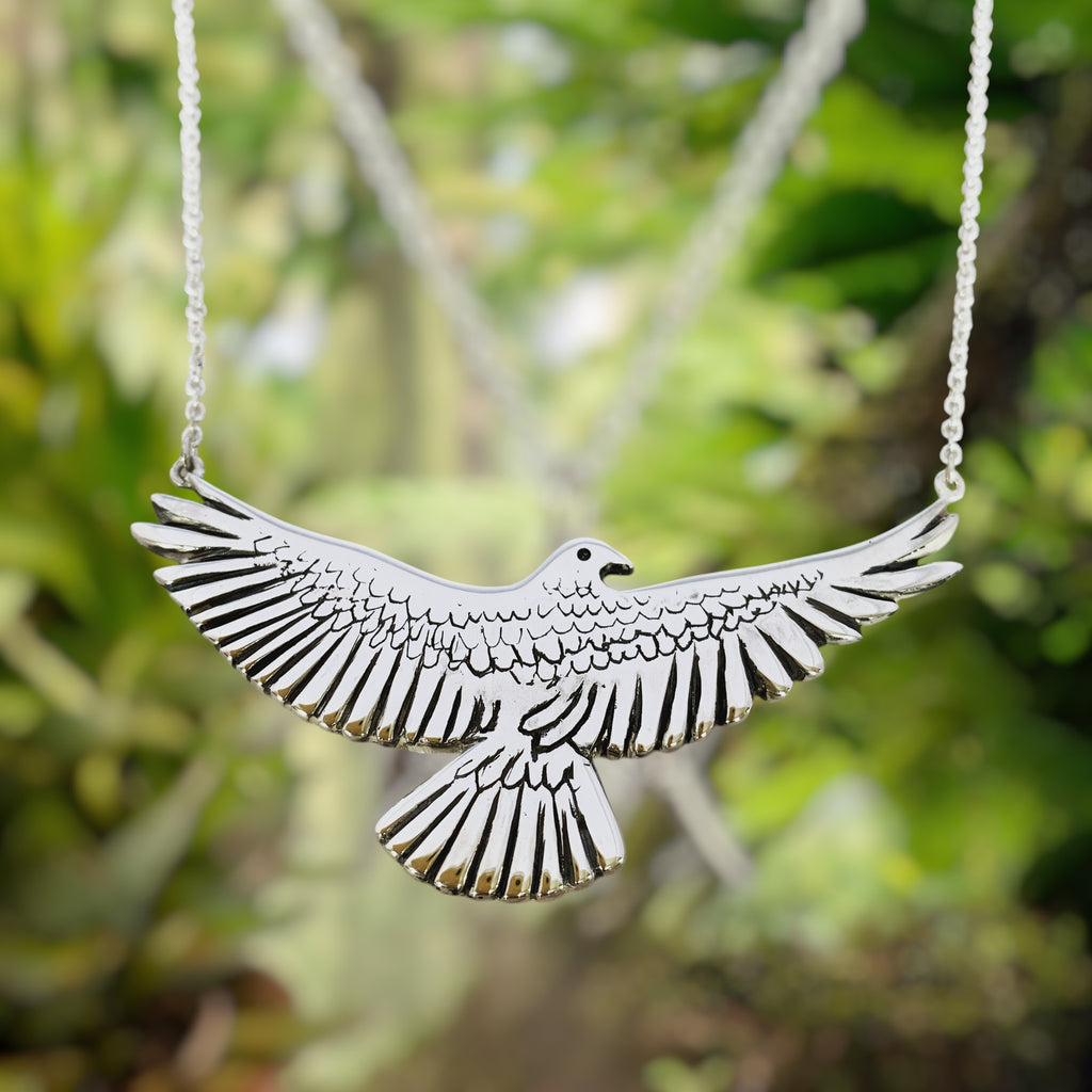 A striking Kea necklace cleverly cast in sterling silver from an original Tania Mallow carving, finished with a sterling silver chain and clasp.