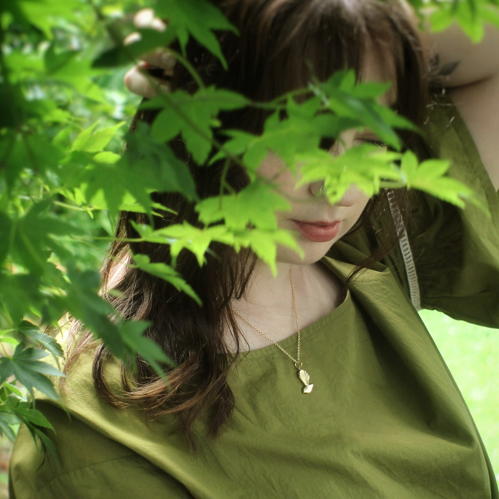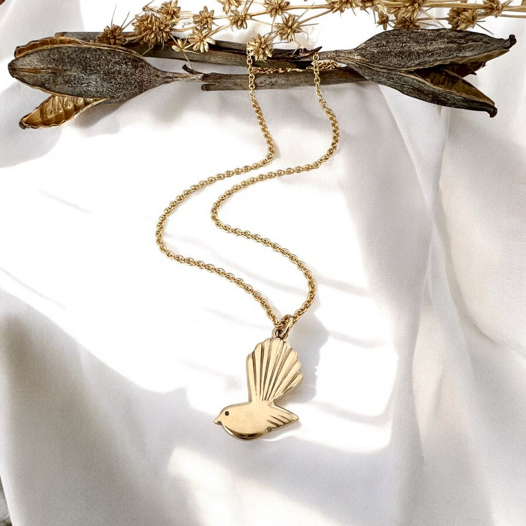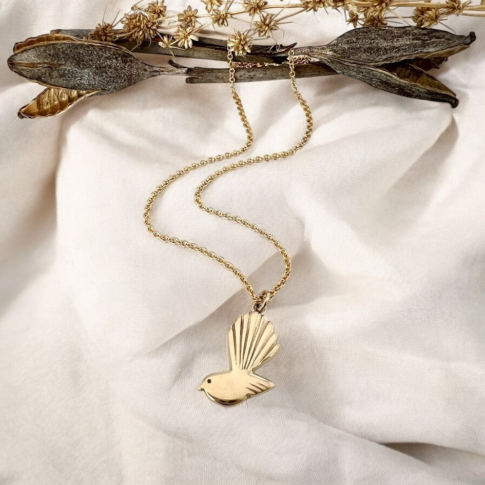 An adorable petite Pīwakawaka necklace cleverly cast in 9ct gold, from an original Tania Mallow carving, finished with a gold plated chain and clasp .