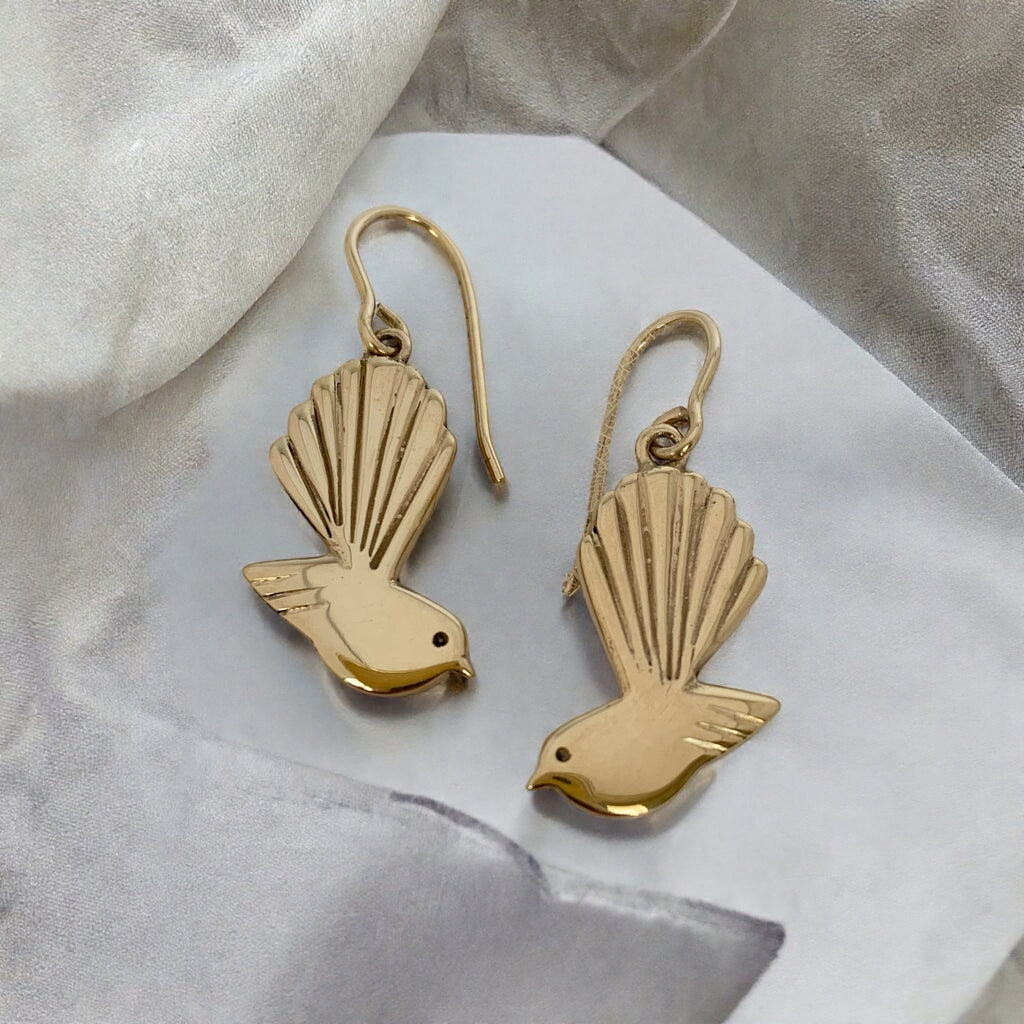 Adorable petite Pīwakawaka earrings cleverly cast in 9ct gold, from an original Tania Mallow carving, finished with 9ct gold hooks.