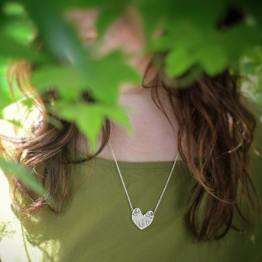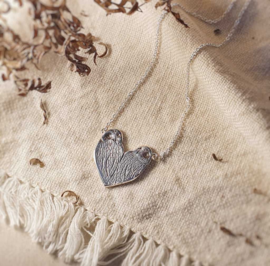 A sweet Ruru heart necklace cleverly cast in sterling silver from an original Tania Mallow carving, finished with a sterling silver chain and clasp.