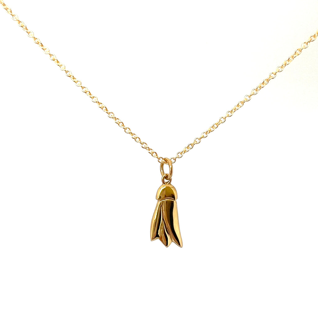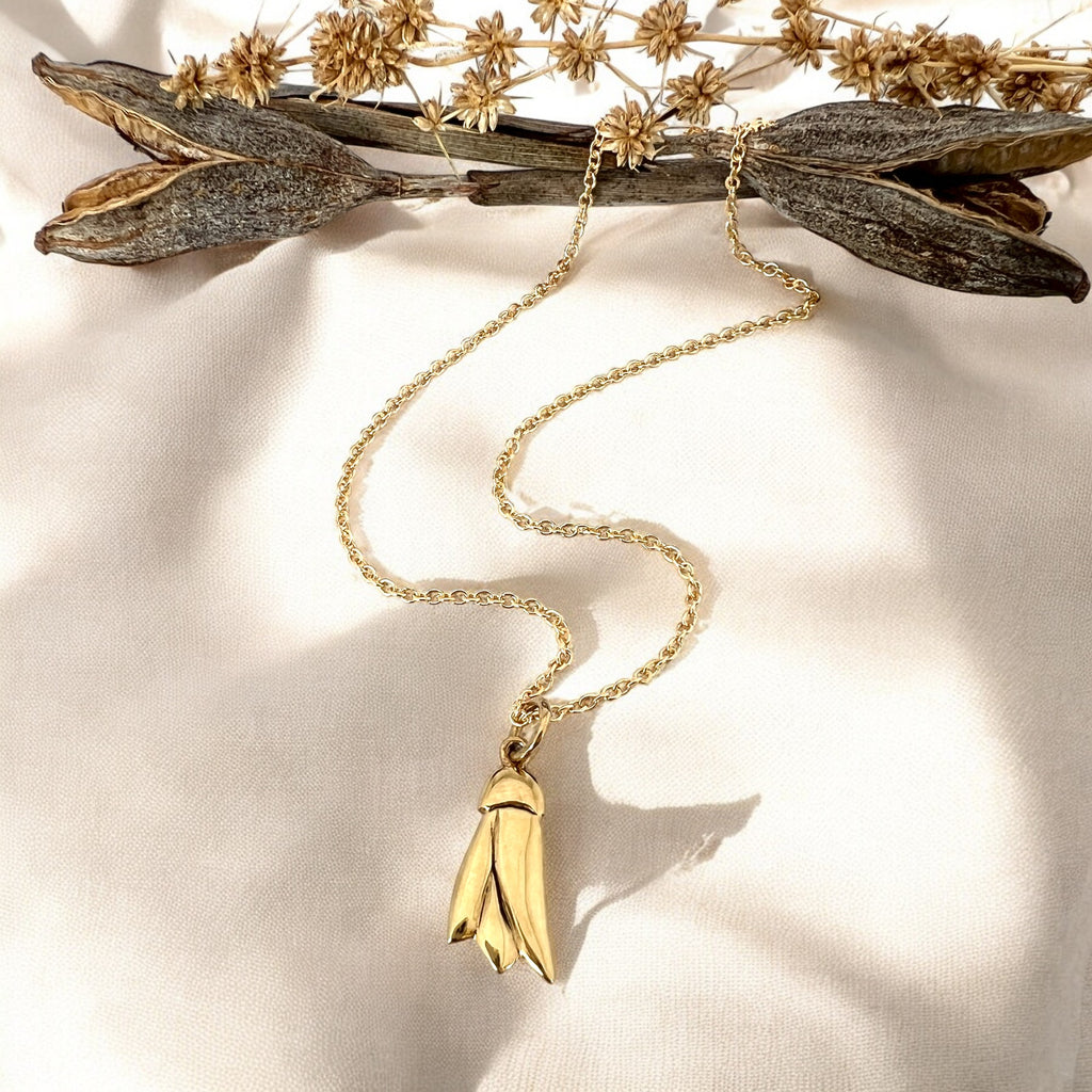 A delightful Gold Petite Kōwhai pendant cast from an original Tania Mallow carving, finished with a Gold plated chain.