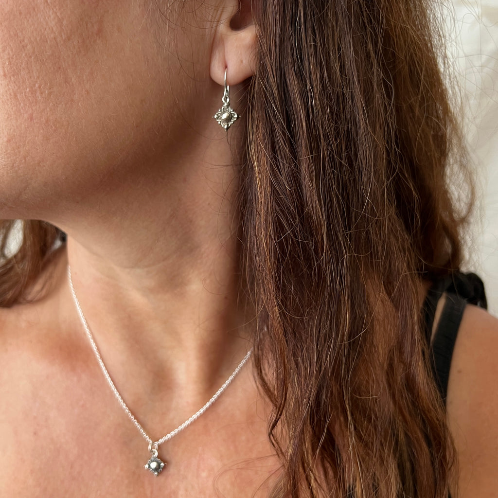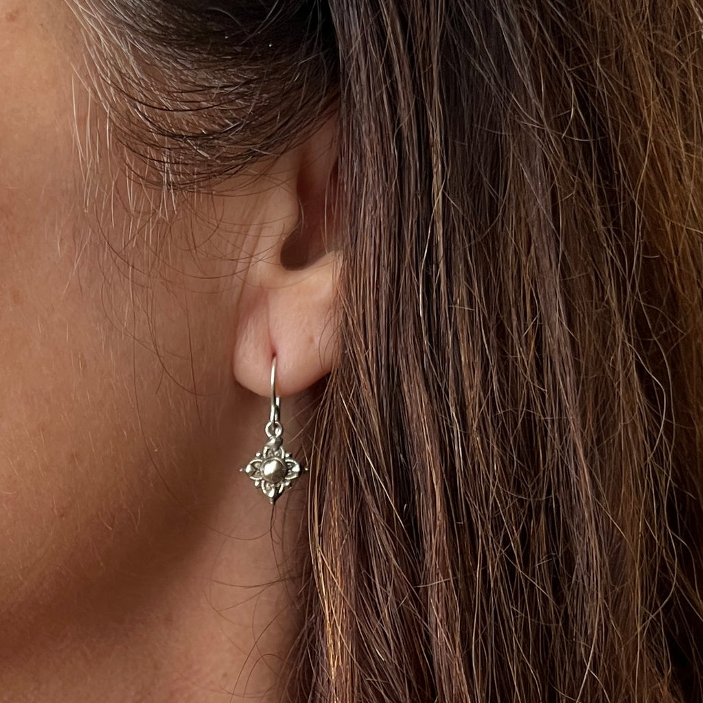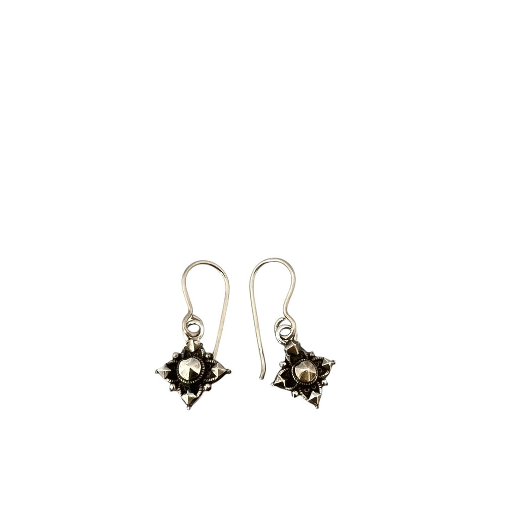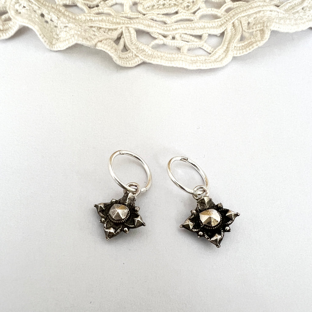 These earrings feature a four pointed vintage inspired star design made in oxidised sterling silver and fitted with petite hinged silver hoops. Also available on hooks, please make a note at checkout.